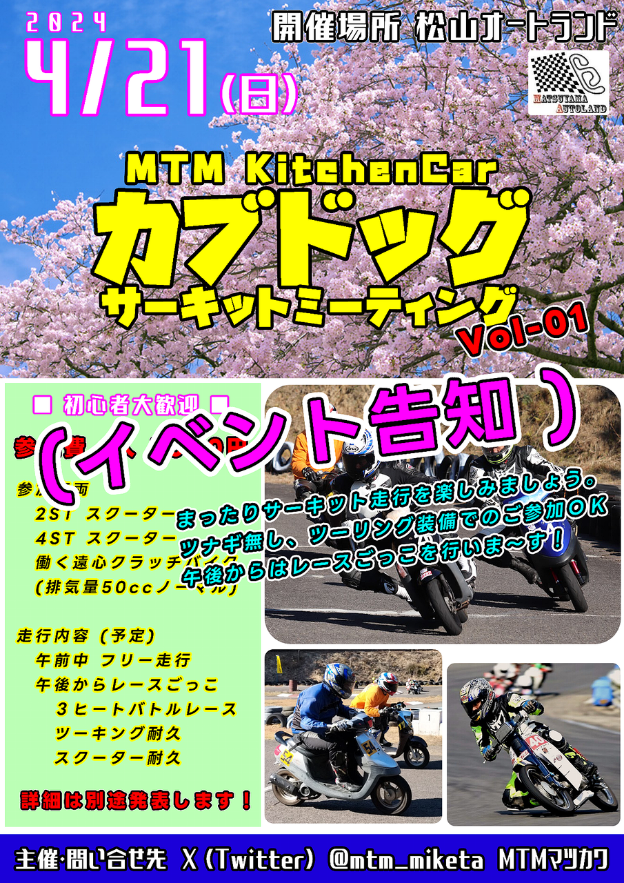 構想1年で未だに完成してないw 当方製作中のキッチンカー「カブドッグ」の販促イベントとして、本日から3ヶ月後の 4/21(日)に松山オートランドでカブドッグ・ サーキットミーティングというゆる~い走行会を行います。