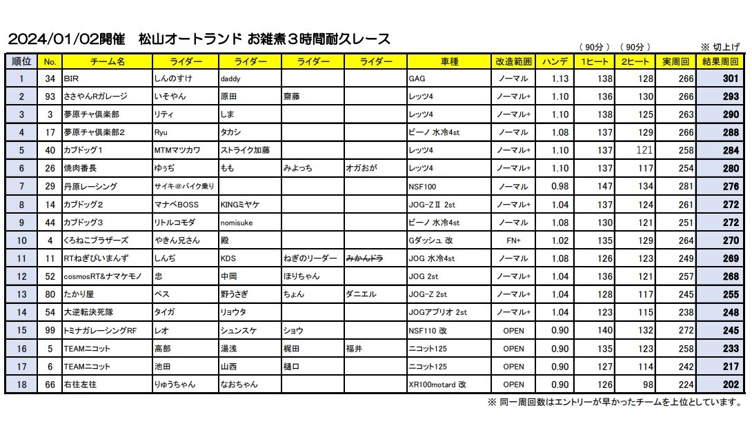 ※ 耐久レースは1名でも複数人(台)でも参加OKですがバイクによってハンデキャップが変わりますので一番不利なハンデでの集計とさせていただきます、